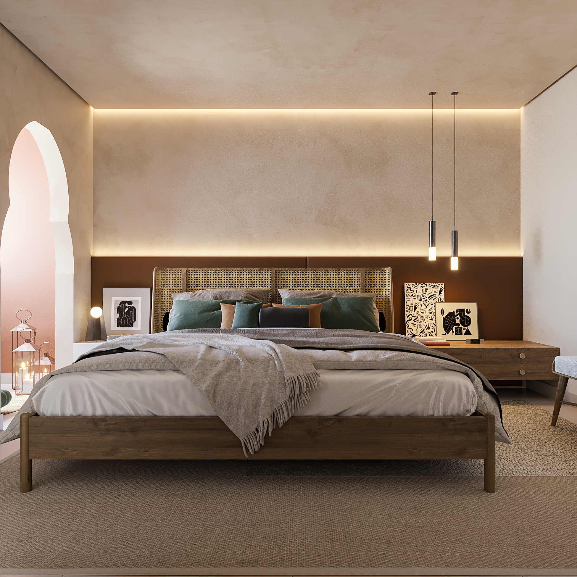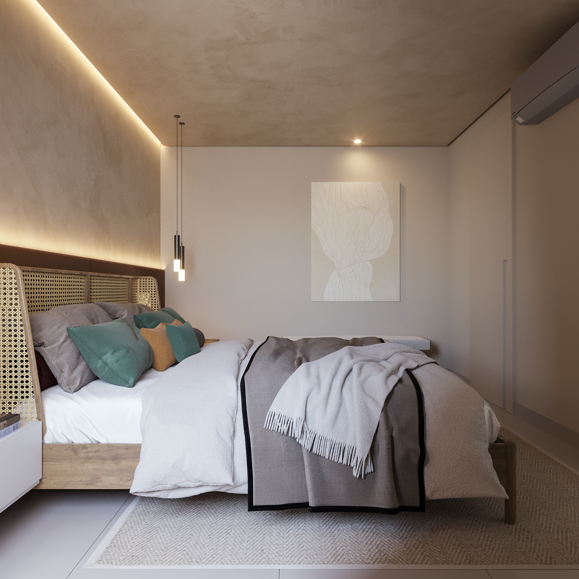 A iluminação acompanha o ritmo do corpo, desenhando atmosferas de descanso e presença.