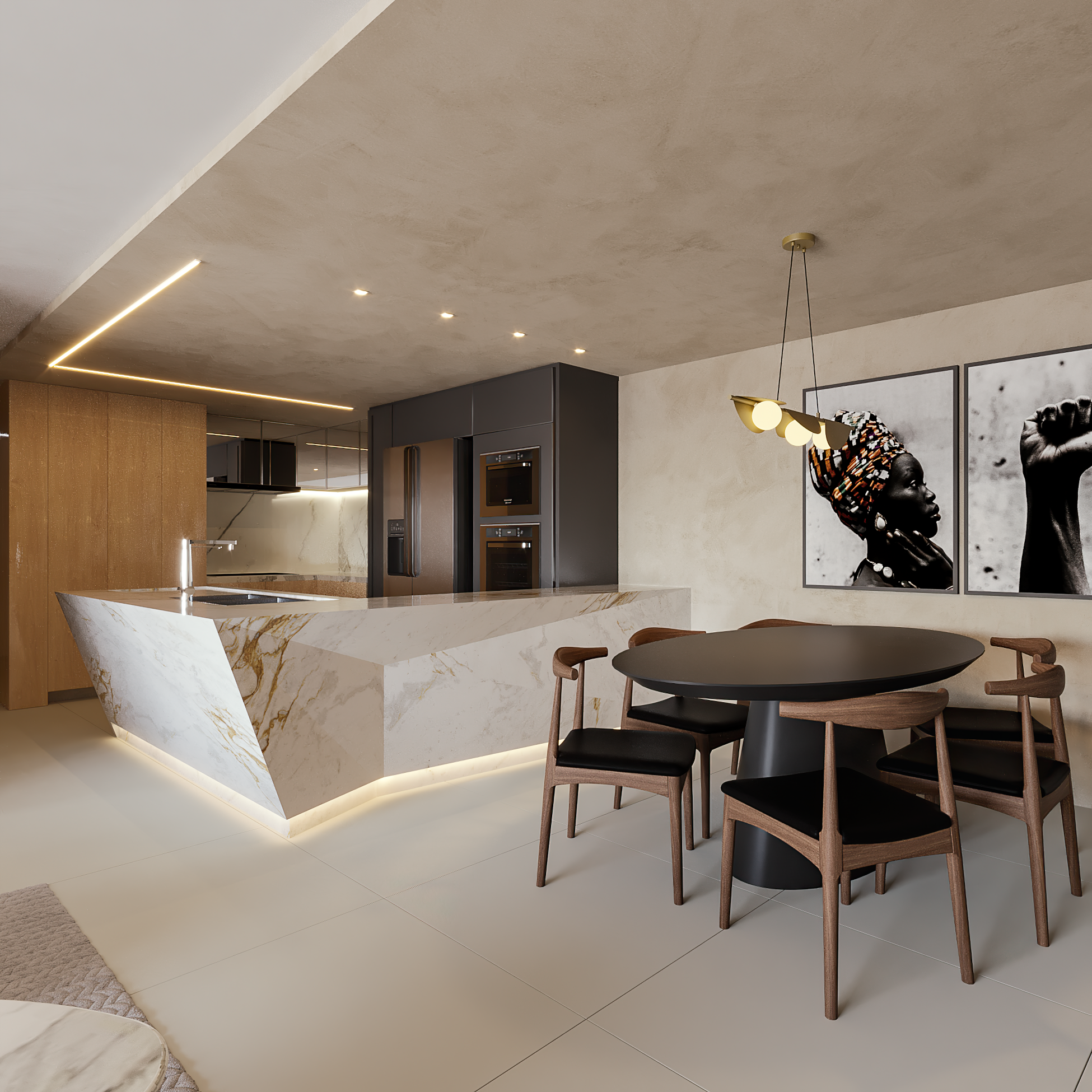 O mármore, em geometria precisa, faz da cozinha uma escultura habitável — cenário de encontros diários, emoldurado pela vista.